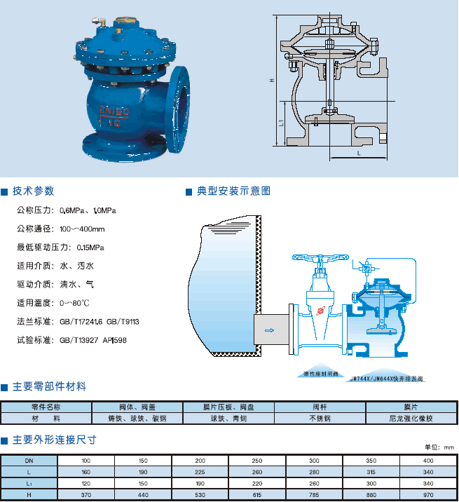 JM744X氣動快開排泥閥,是一種由液壓源或氣動源作執行機構的角型截斷類閥門。通常成排安裝在沉淀池底部外側壁,用以排除池底沉淀的泥砂和污物。該閥由泥龍強化橡膠隔膜將閥門分為兩個腔室,接通液壓或氣動源,采用電動或手動二位四通換向閥控制,實現快速排泥。該閥將隔膜代替活塞,無運動摩檫,更適用于泥漿等顆粒介質,大大提高了閥門的使用壽命。