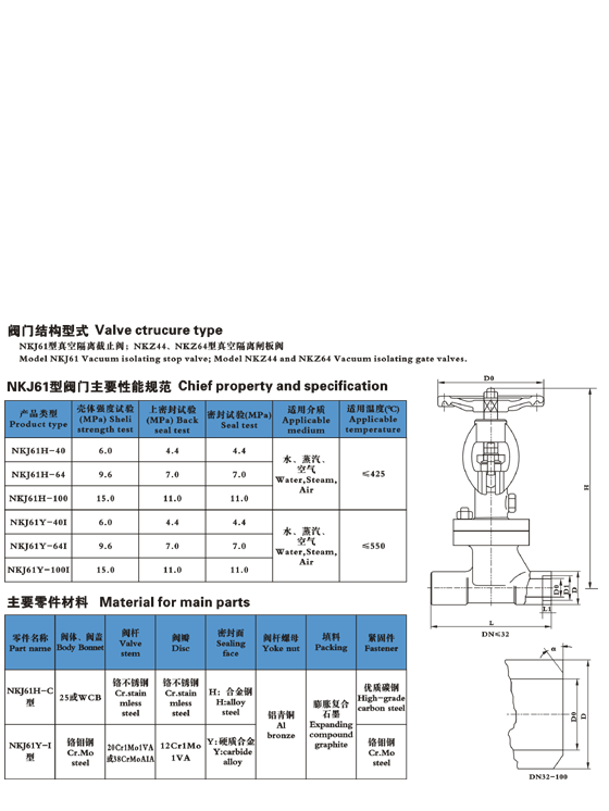 該系列閥門適用于工作溫度≤425℃和≤550℃,工作介質為水、空氣、蒸汽的管路上,作為起閉裝置。尤其適用于火電廠汽機冷凝和真空負壓系統,起到真空密封隔離作用。