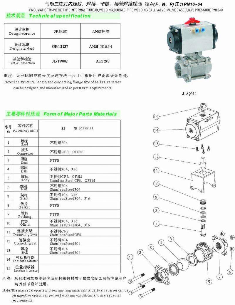 JLQ6氣動三塊式內螺紋/焊接/卡箍/接管焊接球閥是我公司的優質產品之一,在上海JLQ6氣動三塊式內螺紋/焊接/卡箍/接管焊接球閥廠家中享有極高的品質聲譽與服務評價.