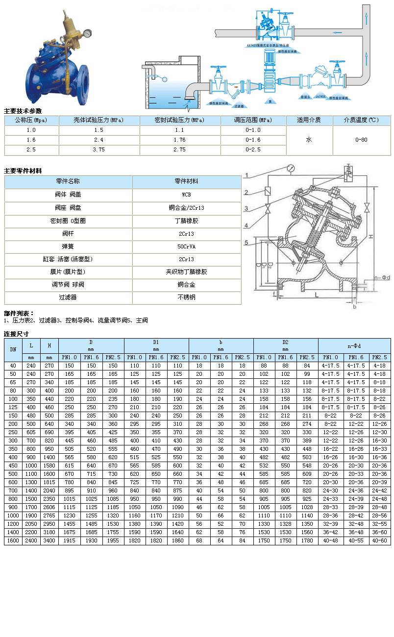 功能與用途本閥門一般安裝在供水管網系統的上游,實現對其下游管網或裝置的減壓穩壓功能。本系列閥門產品廣泛用于高層建筑、生活區域或其它供水管網系統的水壓控制。
