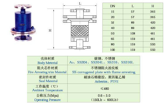 詳細(xì)說(shuō)明: ① 阻火器適用于儲(chǔ)存閃點(diǎn)低于28℃的甲類(lèi)油品和閃點(diǎn)低于28℃的乙類(lèi)油品,也適用于儲(chǔ)存物料以氮?dú)夥忭數(shù)墓绊敼奚希[石阻火器與網(wǎng)型阻火器原理同上,用在管道上。 ②與呼吸閥、呼吸人孔配套使用,也可單獨(dú)使用。