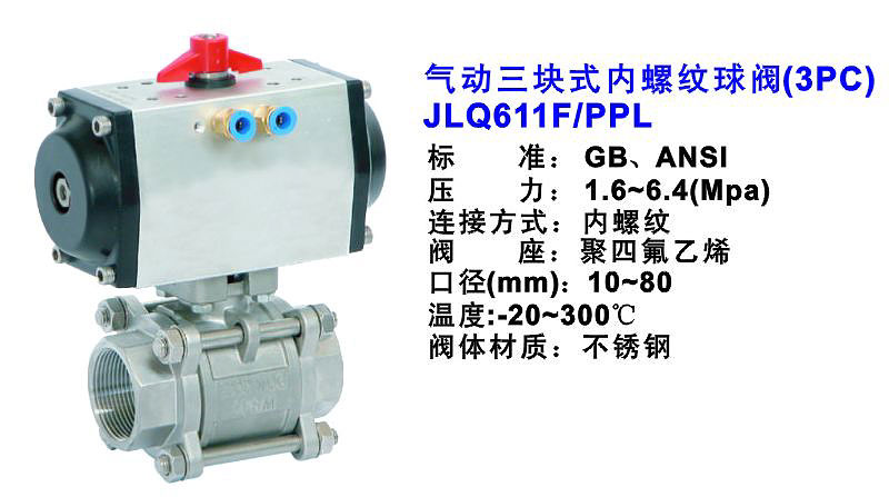 氣動三塊式內螺紋球閥JLQ611F是我公司的優質產品之一,在上海氣動三塊式內螺紋球閥JLQ611F廠家中享有極高的品質聲譽與服務評價.